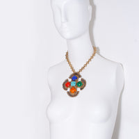This stunning pendant is part of CASTLECLIFF's 1970's southwest series, a collection filled with Native American figural elements, enamel feather imagery and brilliantly colored poured glass stones. Designed by the prolific Lawrence (Larry) Vrba, this collection of rare and highly sought after and was designed and manufactured in NYC with large poured glass stones that were made from melted down beads at CASTLECLIFF's own midtown glass factory.