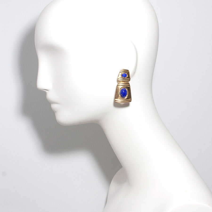 Sculptural gold-tone drops with vibrant lapis-colored cabochons, hinged for a touch of movement.