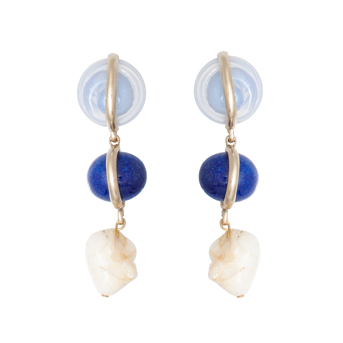 The Gradient Earring is a study in color and contrast. Vibrant vintage stones are stacked in a vertical drop, each wrapped in a sculptural brass setting and punctuated with an irregular mother of pearl bead. Handcrafted in NYC from upcycled brass and vintage materials, with subtle variations that make every pair unique.