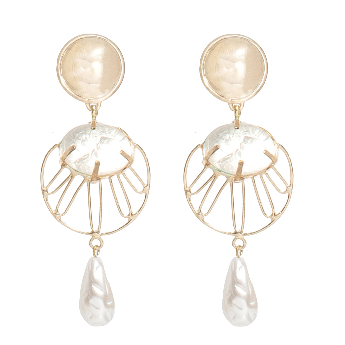An open brass frame, reminiscent of a shell’s delicate lines, holds a vintage glass stone with striking depth. The Selkie Earrings are finished with an upcycled pearl drop, blending sculptural form with organic elegance.