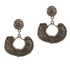 Unique silver-tone hoops with intricate beaded textures, suspended from matching textured studs.