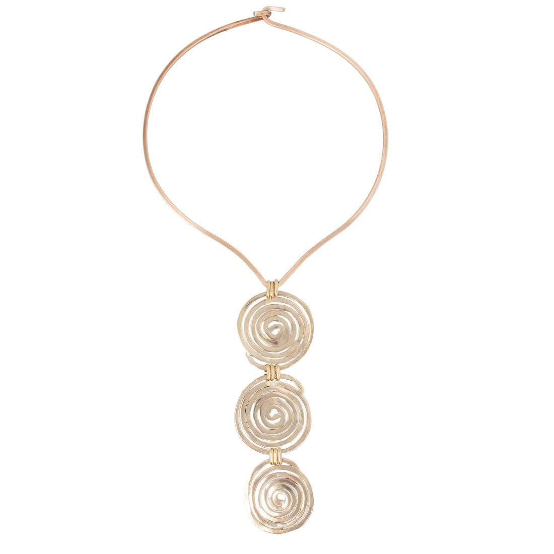 The Trace Necklace explores repetition, rhythm, and the quiet power of a continuous line. Three hand-formed brass spirals cascade from a softly contoured collar, each coil shaped by hand to reveal subtle variation and texture. Sculptural yet restrained, the necklace sits close to the body with a fluid, elongated drop that moves naturally with the wearer.